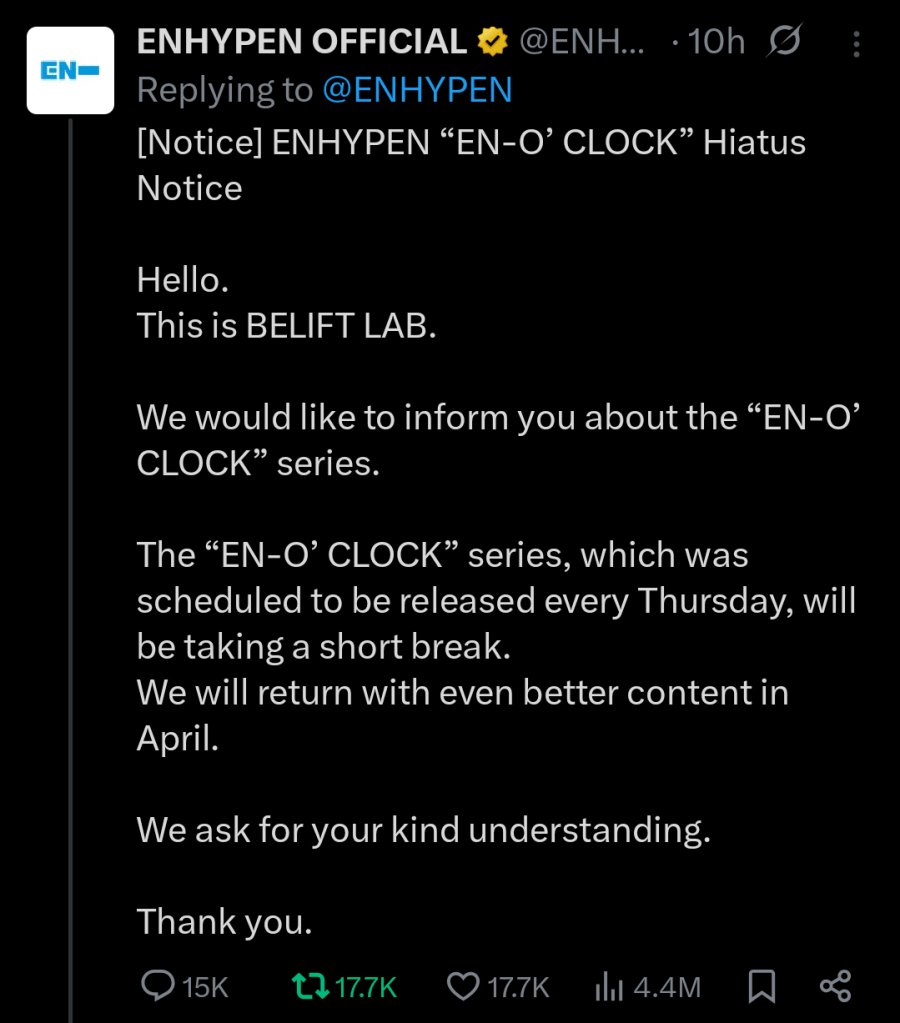 BELIFT has released another statement on X, on March 11th 2026 at 21:00 KST, regarding ENHYPEN’s variety show “EN-O’CLOCK” being cancelled.