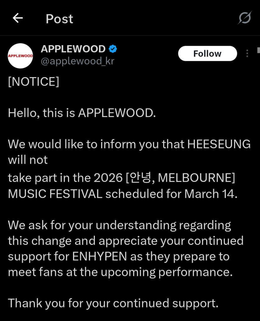 If you remember from my second update, I wrote about APPLEWOOD’s statement saying that Heeseung will not be performing in Australia with the rest of the ENHYPEN members for their first visit as a group. Today, 14th March 2026, the concert happened as a 6-member group, as you could imagine. However, what really caused fans to be angry, was the picture displayed on the screen before they had started to perform.