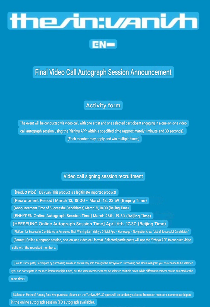 From March 13th to March 18th 2026, there is a final YZY fancall event purchase period for ENHYPEN’s album The Sin: Vanish which includes the 6 ENHYPEN members as an option and Heeseung. However Heeseung is scheduled to have it as a different date from the other members, on the 6th April, instead of the 26th March.