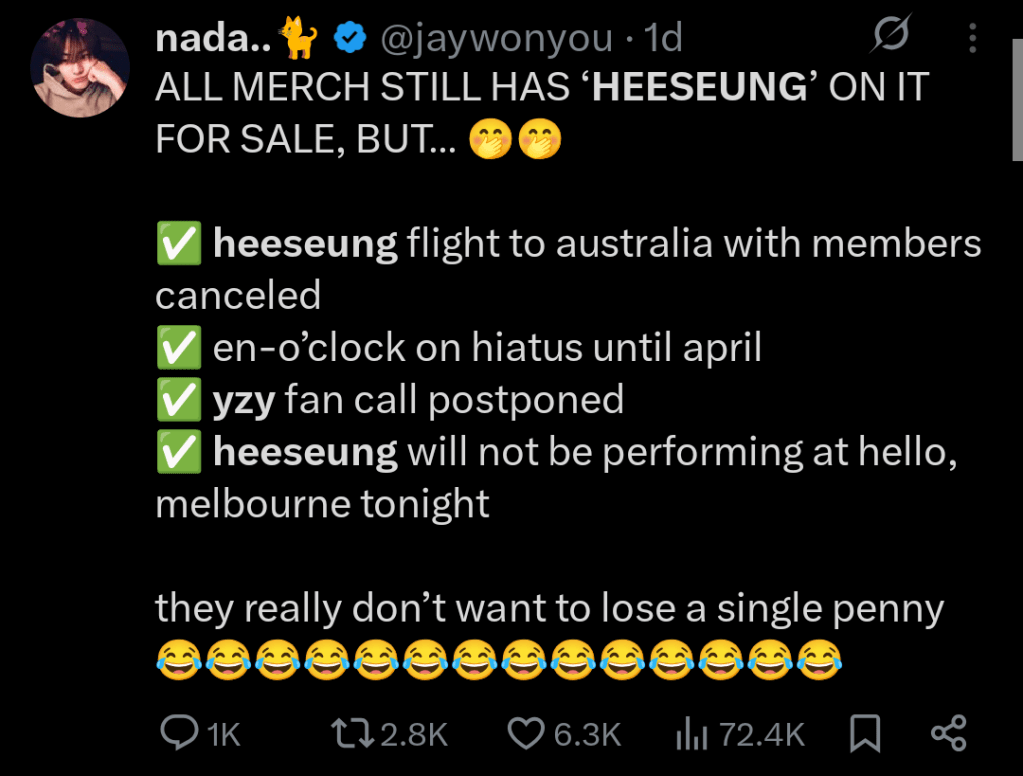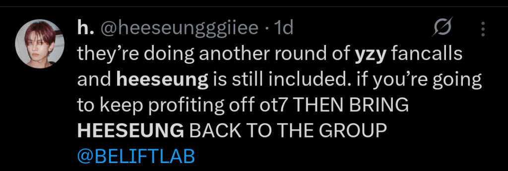 Today, March 15th 2026, The Korea Herald released an article claiming that BELIFT has re-affirmed that Heeseung will not be returning to ENHYPEN. Fans on all social media platforms are criticising this article for many reasons. One being that BELIFT themselves have not released this statement, so how are we to trust this article? Also, the article says and I quote: “According to the agency, Enhypen’s schedule remains extremely demanding throughout the year, making it difficult for members to develop independent musical projects while maintaining full group activities.” This is almost a confession to how the company overworks their artists; as their company, they are in-control of their schedule and can change this, if they really wanted to. As I have said at the beginning, other people have been able to do solo careers whilst staying under their company (e.g. Choi Yeonjun in TXT) – so how is this any different? The backlash they are facing for removing Heeseung, without a goodbye or any sort of actual reasoning, is almost Karma.